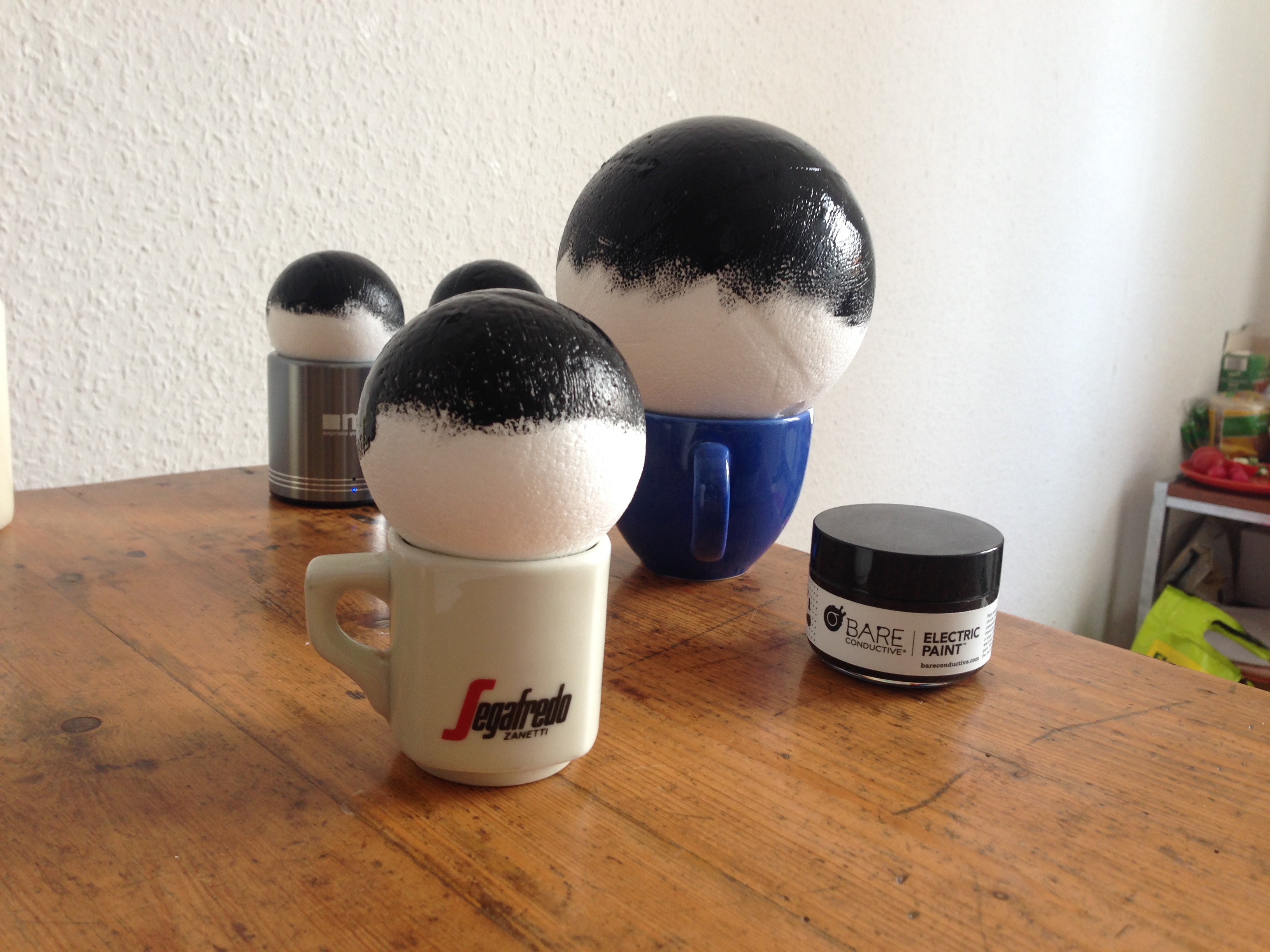I prototyped a litte exhibit using Bare Conductives Touch Board. I painted several polystyrene balls with conductive paint. This can then be ues as a capacitive sensor and fed into an arduino board such as the touch Board. I assigned the black Hole sound waves to each sphere, so on approach to the black hole, the sound file is played. I’d like to imagine this as an installation an a space, where walking towards big black spheres triggers the sound.